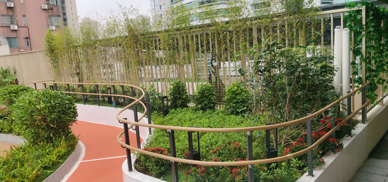 同時(shí),頂樓設(shè)有屋頂康復(fù)花園,采用了我們公司提供的能隨處折彎的室外抗菌扶手。如圖二/圖三: